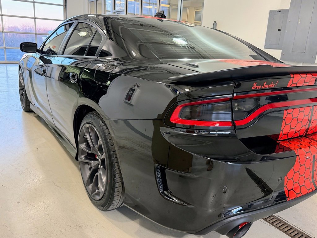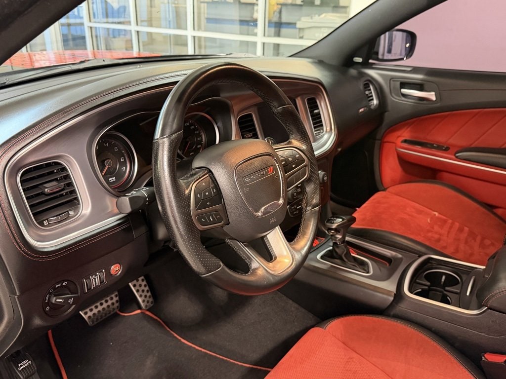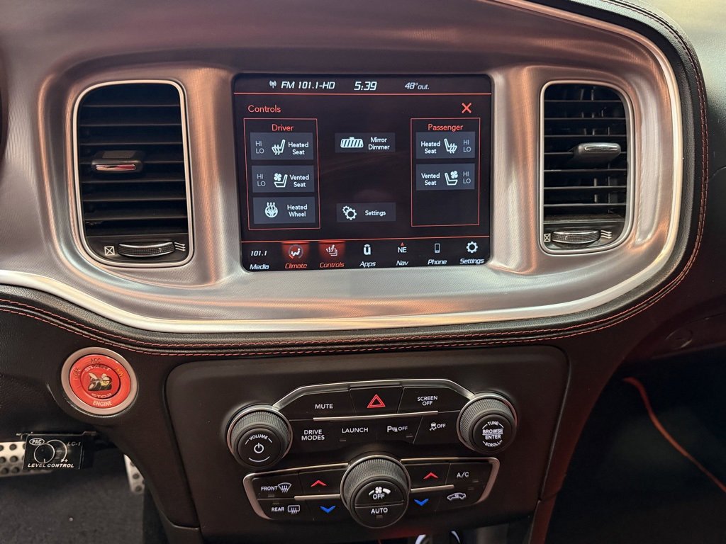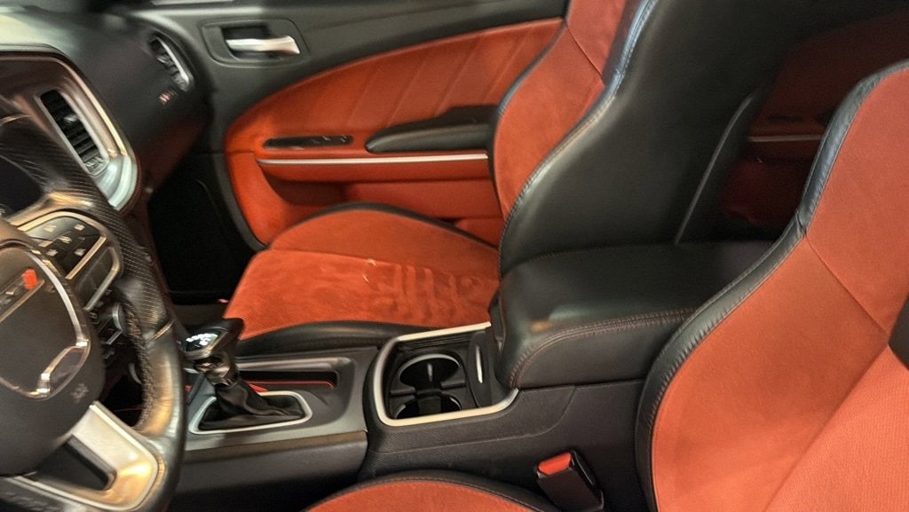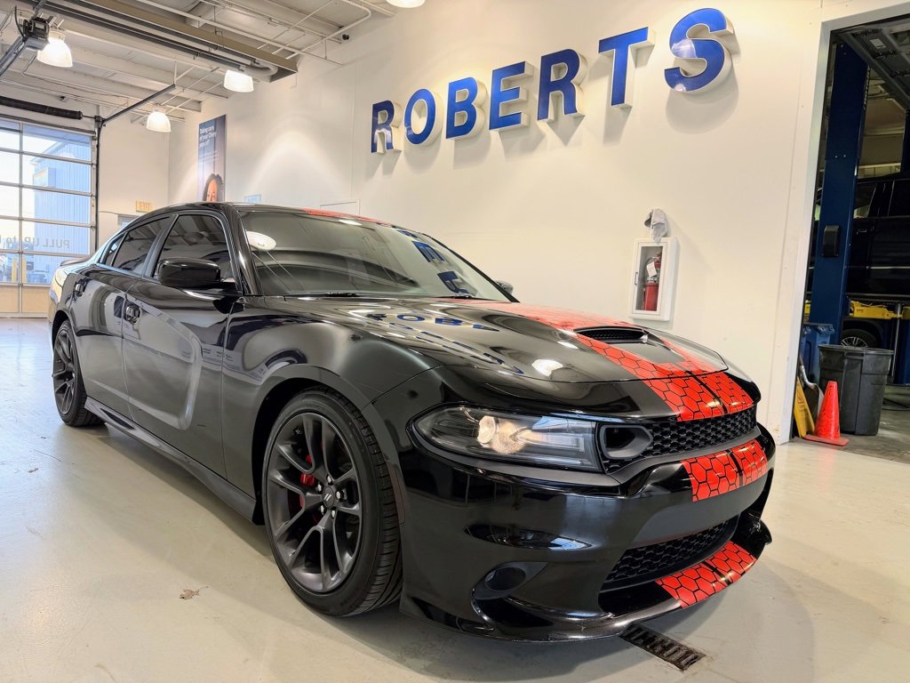 FREE LIFETIME POWERTRAIN WARRANTY, Charger R/T Scat Pack, SRT HEMI 6.4L V8 MDS, Pitch Black Clearcoat, Ruby Red/Black Artificial Leather, 4-Wheel Disc Brakes, 5-Year SiriusXM Traffic Service, 5-Year SiriusXM Travel Link Service, 6 Speakers, ABS brakes, Air Conditioning, Alloy wheels, AM/FM radio: SiriusXM, Anti-whiplash front head restraints, Apple CarPlay/Android Auto, Auto Adjust In Reverse Exterior Mirrors, Auto-Dimming Exterior Driver Mirror, Auto-dimming Rear-View mirror, Automatic temperature control, Black-Edged Premium Floormats, Blind Spot & Cross Path Detection, Blind Spot Memory/Power/Heat Mirror, Brake assist, Brake Calipers - Red, Bumpers: body-color, Cloth Performance Seats w/Bee Logo, Compass, Delay-off headlights, Driver & Passenger Lower LED Lamps, Driver door bin, Driver vanity mirror, Dual front impact airbags, Dual front side impact airbags, Electronic Stability Control, Emergency communication system: SiriusXM Guardian, Engine Block Heater, Exterior Mirrors Courtesy Lamps, Four wheel independent suspension, Front anti-roll bar, Front Bucket Seats, Front Center Armrest, Front dual zone A/C, Front fog lights, Front Overhead LED Lighting, Front reading lights, Fully automatic headlights, Garage door transmitter: HomeLink, Heated 2nd Row Seats, Heated door mirrors, Heated front seats, Heated steering wheel, Illuminated entry, Illuminated Rear Cupholders, Knee airbag, Leather Shift Knob, Low tire pressure warning, Navigation & Travel Group, Occupant sensing airbag, Outside temperature display, Overhead airbag, Overhead console, Panic alarm, ParkView Rear Back-Up Camera, Passenger door bin, Passenger vanity mirror, Plus Group, Power door mirrors, Power driver seat, Power Driver/Passenger 4-Way Lumbar Adjust, Power Front Driver/Passenger Seats, Power steering, Power Sunroof, Power Tilt/Telescope Steering Column, Power windows, Premium-Stitched Dash Panel, Quick Order Package 21W, Radio data system, Radio: Uconnect 4C Nav w/8.4 Display, Radio: Uconnect 4C w/8.4 Display, Radio/Driver Seat/Mirrors Memory, Rear anti-roll bar, Rear reading lights, Rear Seat Armrest w/Storage Cupholder, Rear seat center armrest, Rear window defroster, Red-Edged Premium Floor Mats, Remote keyless entry, Scat Pack Logo Nappa/Alcantara Seat, Security system, SiriusXM Traffic Plus, SiriusXM Travel Link, Speed control, Speed-Sensitive Wipers, Split folding rear seat, Spoiler, Sport steering wheel, Steering wheel mounted audio controls, Tachometer, Telescoping steering wheel, Tilt steering wheel, Traction control, Trip computer, Variably intermittent wipers, Ventilated Front Seats, Wheels: 20 x 9 Lo Gloss Granite Crystal, Charger R/T Scat Pack, SRT HEMI 6.4L V8 MDS, Pitch Black Clearcoat, Ruby Red/Black Artificial Leather.