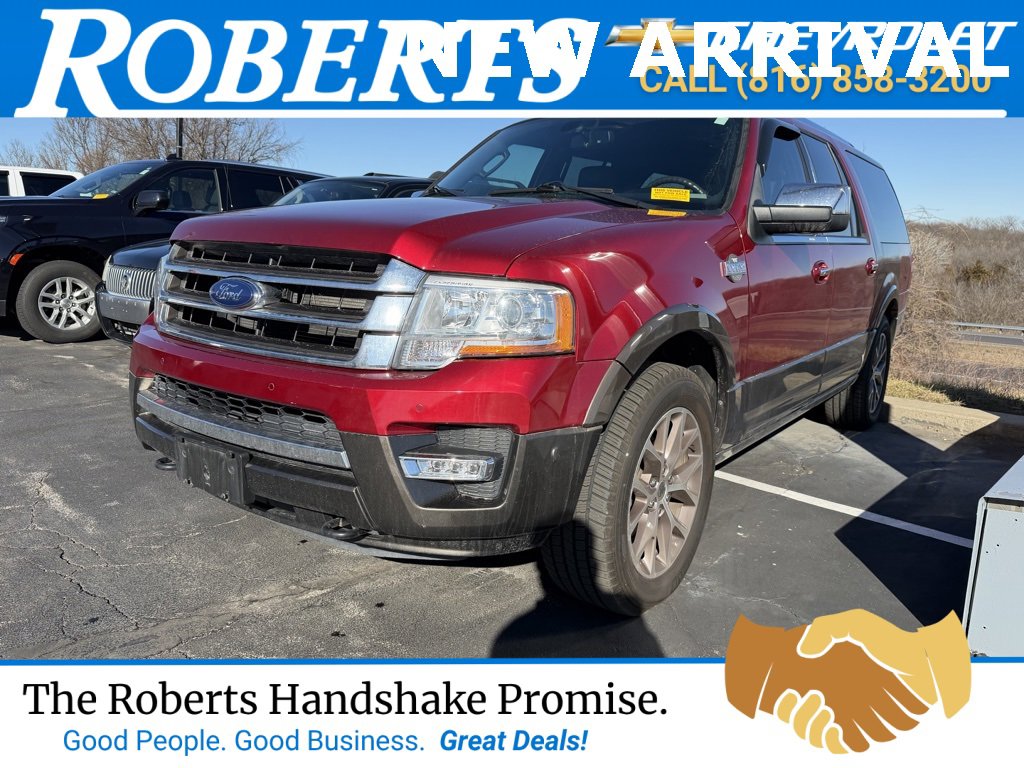 Recent Arrival! 2015 Ford Expedition EL King Ranch 4D Sport Utility 4WD 3.5L V6 Vermillion RedExpedition EL King Ranch, 4WD, Vermillion Red, ABS brakes, Alloy wheels, Compass, Electronic Stability Control, Front dual zone A/C, Heated & Cooled Perforated Leather Fr Bucket Seats, Heated door mirrors, Heated front seats, Heated rear seats, Illuminated entry, Low tire pressure warning, Power Liftgate, Remote keyless entry, Traction control.At Roberts Chevrolet in Platte City, MO, we take pride in being a family-owned and operated dealership serving Platte City and the greater Kansas City area since 1999 reflecting a longstanding commitment to our community. We believe a handshake is more than a gesture; it's a symbol of trust, integrity, and our unwavering commitment to our customers. As part of that commitment, we are proud to offer a Free Lifetime Powertrain Warranty on qualifying new and used vehicles. This exclusive benefit provides long-term peace of mind at no cost to our customers further reinforcing our promise of honest value, transparent deals, and a truly worry-free ownership experience. Our Free Lifetime Powertrain Warranty is Nationwide - with NO mileage limits and NO time limits. Our Handshake Promise ensures a transparent, no-pressure car-buying experience where every customer is treated like family. As your local Chevrolet dealer, we understand the importance of trust and transparency. Thatâs why our customers appreciate our straightforward approach honest deals without hidden fees, and the price you see is the price you pay.Our dealership is more than just a place to buy a car; it's a part of the community. With a wide selection of new and pre-owned Chevrolet vehicles, we cater to the diverse needs of drivers in Platte City and surrounding areas including Weston, St. Joseph, Liberty, Kansas City, North Kansas City, Parkville, Leavenworth, KS, and Lansing, KS. Our commitment to excellence extends beyond sales, offering top-notch service and maintenance to keep your vehicle running smoothly throughout its lifetime. Thank you for taking the time to look at this fantastic 2015 Ford Expedition EL. Join the many satisfied customers who have found their perfect vehicle at Roberts Chevrolet. Visit us today and see why we're known for being the gold standard. Just good people doing good business with great deals who still believe in the golden rule! Important Pricing & Availability Information Roberts Chevrolet Out-of-state delivery is available; a delivery charge may apply. To confirm vehicle availability, schedule a test drive, or inquire about new arrivals, call us at (816) 858-3200. Due to high demand, appointments are strongly recommended. Disclaimer: Images and graphics are for illustrative purposes only and may be updated at the dealerships discretion.